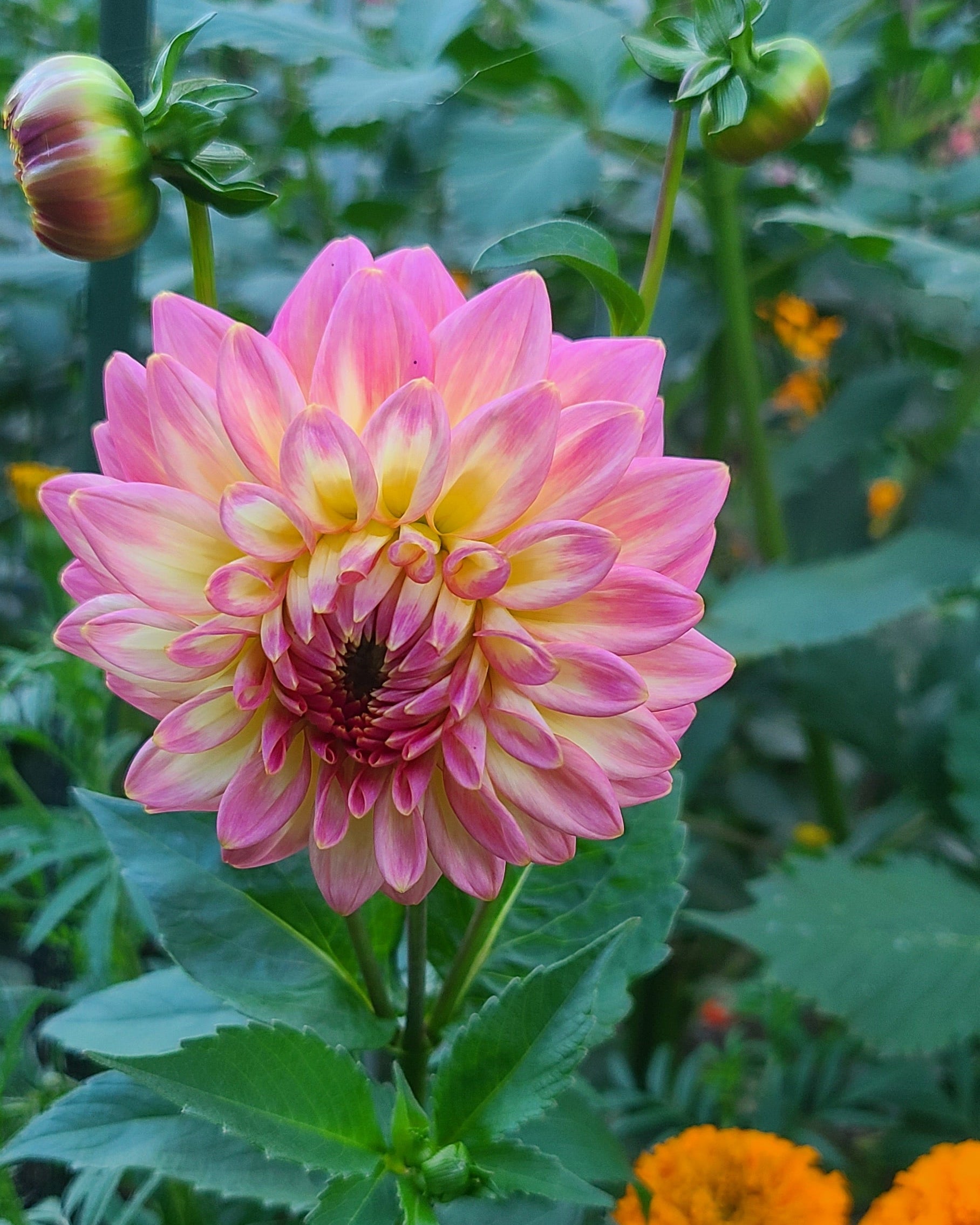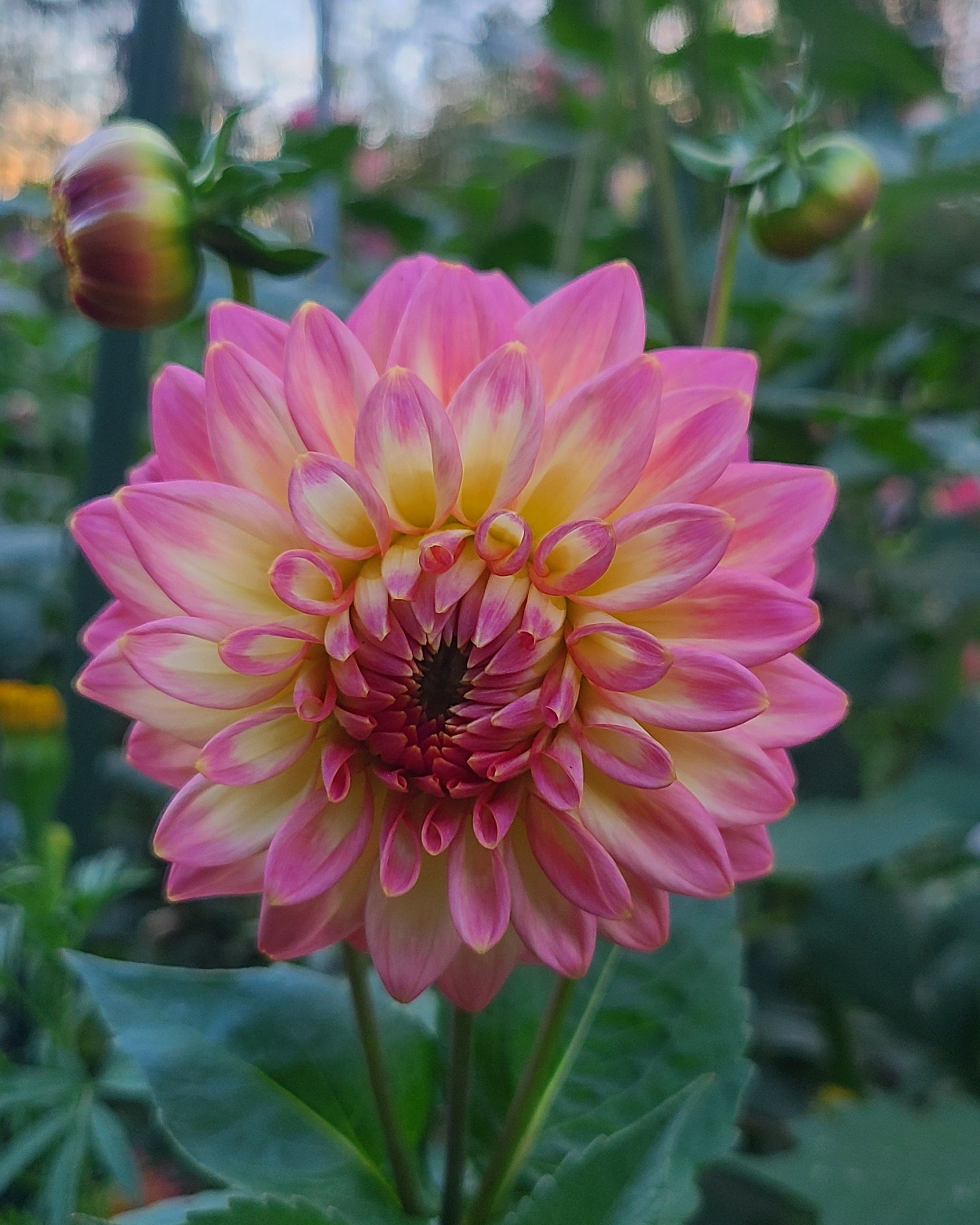 Pretty creamy white centers with soft pink ends. Formal decorative type, size B 5-6" flower. An abundantly flowering beauty. She has good stems on an average height plant.