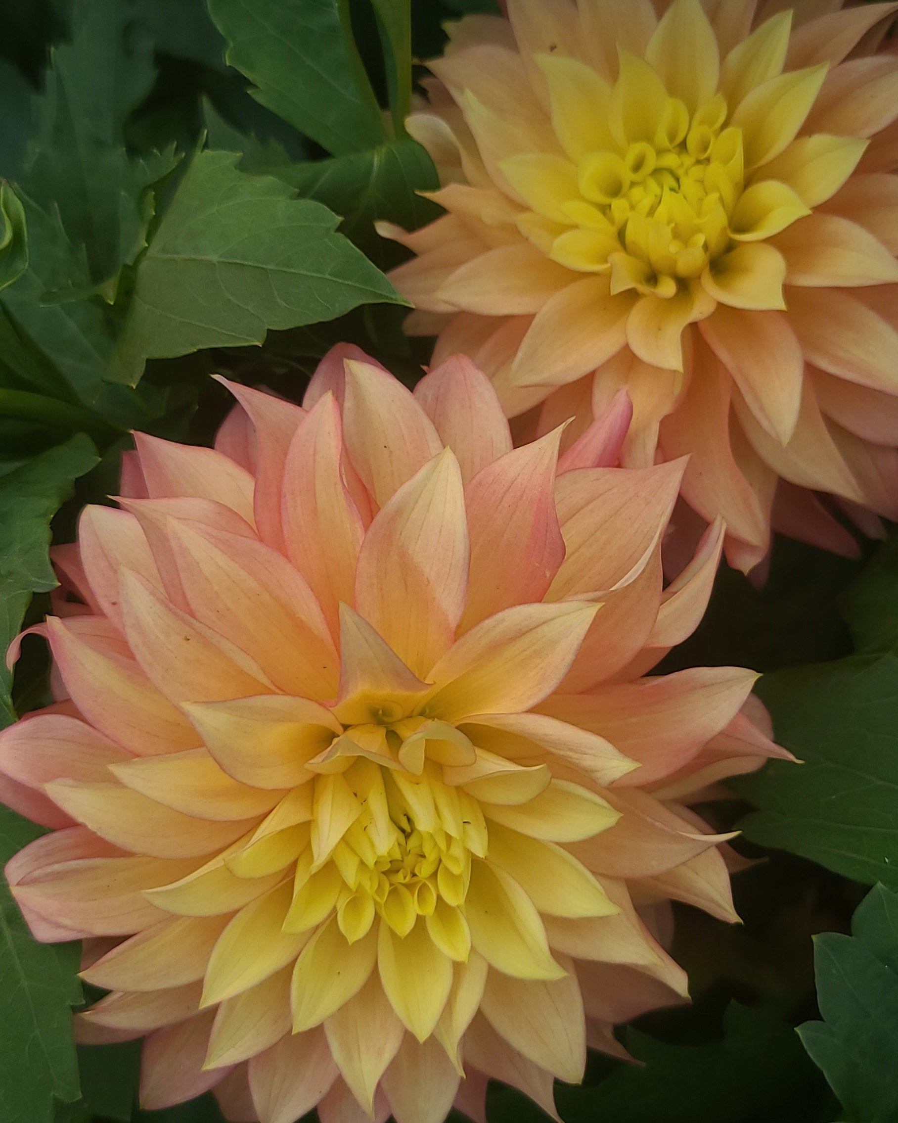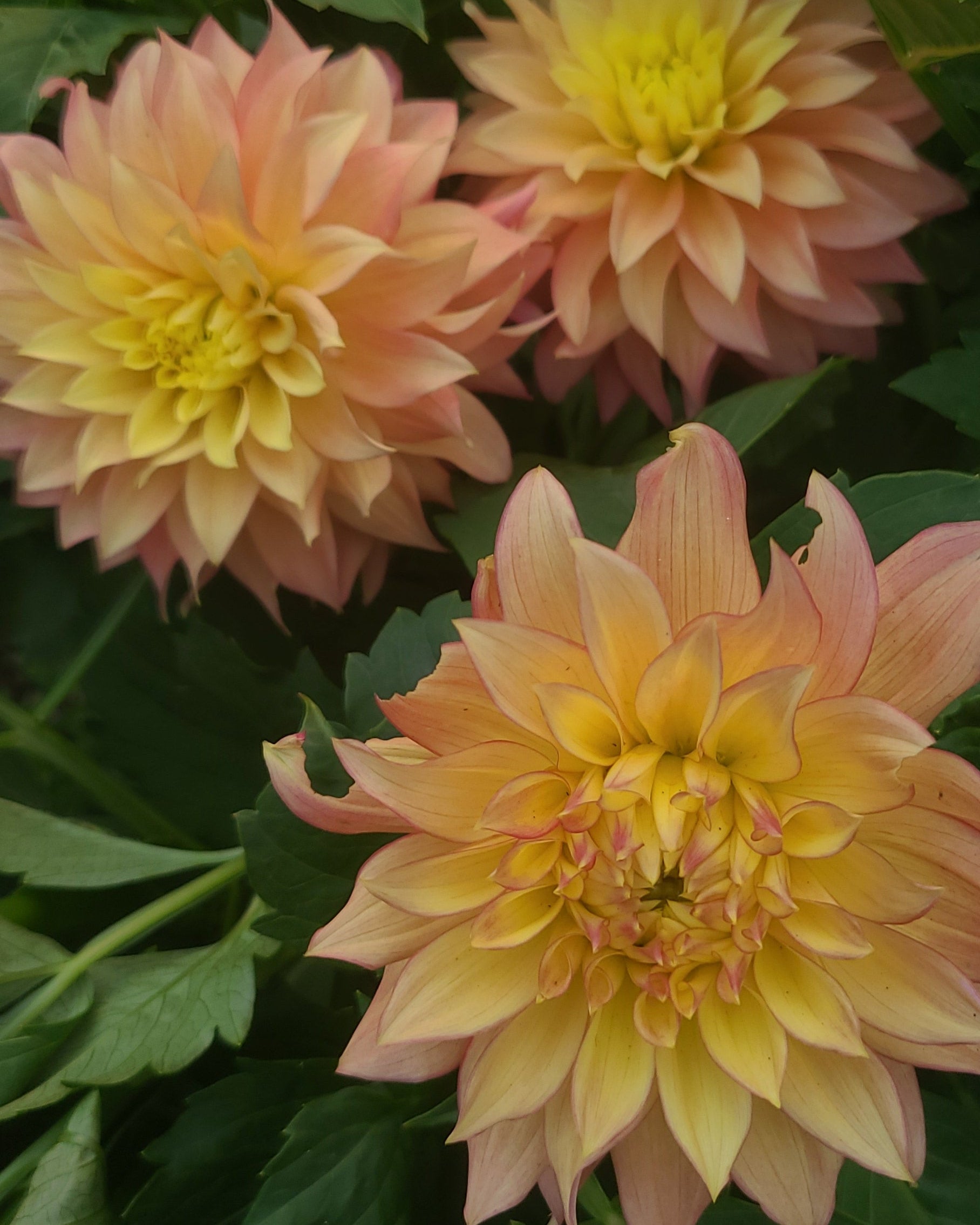 Aptly named, this beautiful ombre from yellow to peachy formal decorative is about 5-6" across and sends up multiple blooms at once! It's not super tall in my garden, growing about 3' tall.