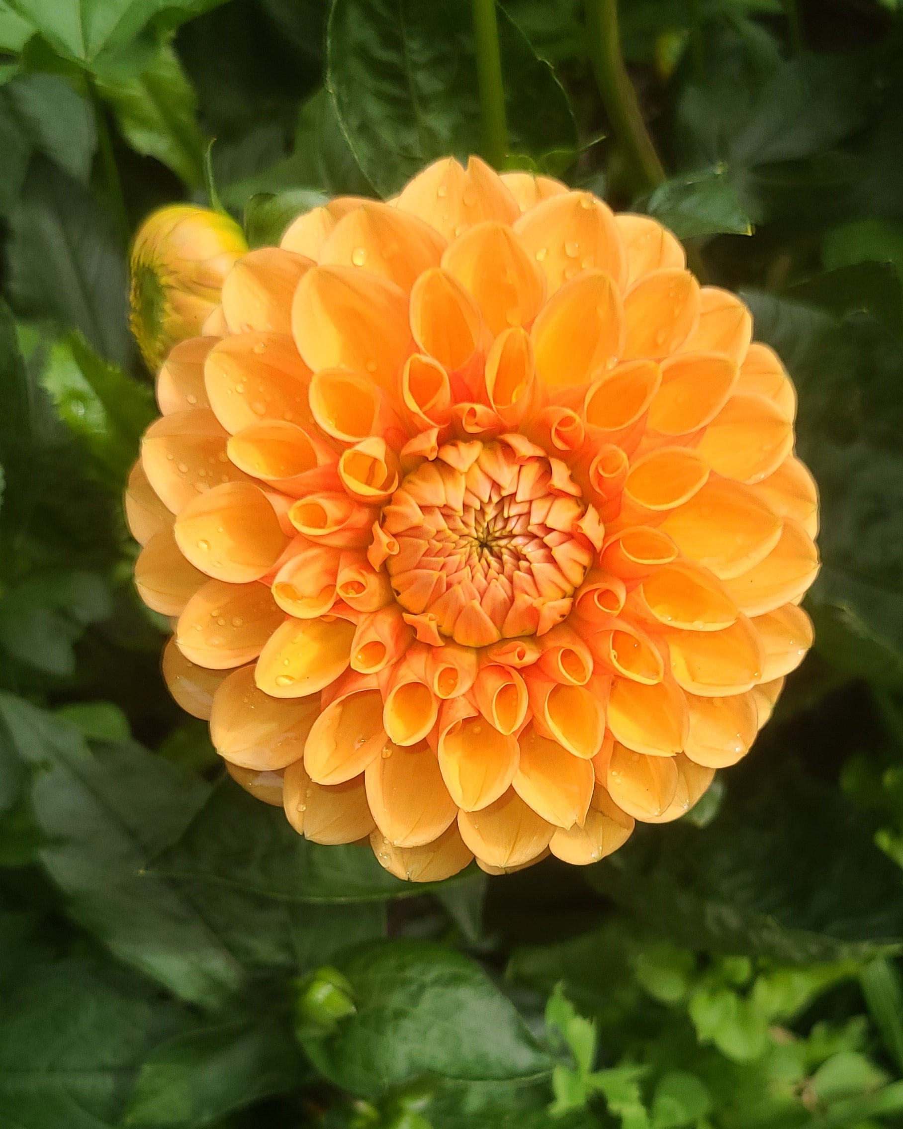 This is a smaller very orange formal decorative dahlia, about 3.5" across. It is a wonderful color for fall bouquets. It grows about 4-5' tall in my garden.