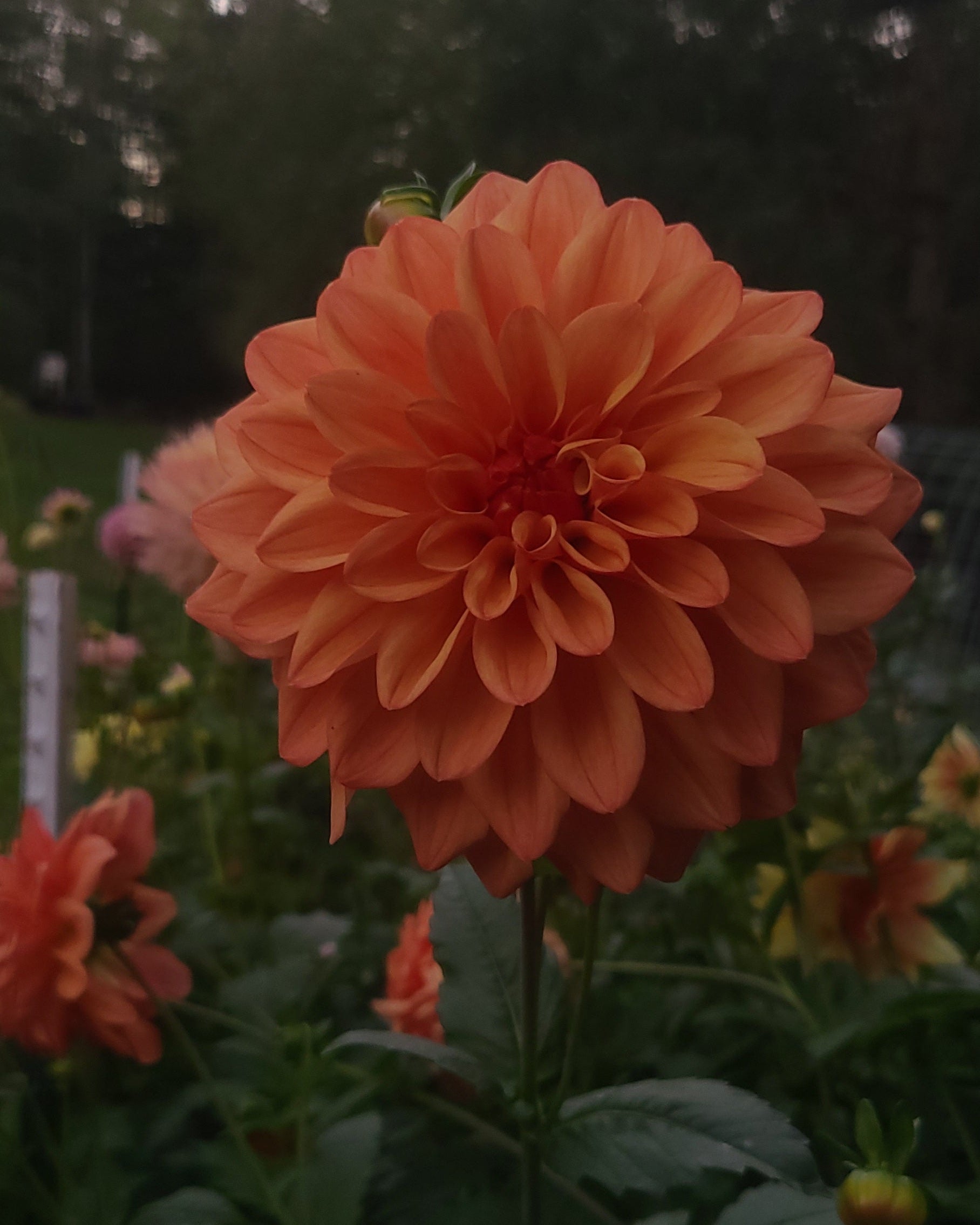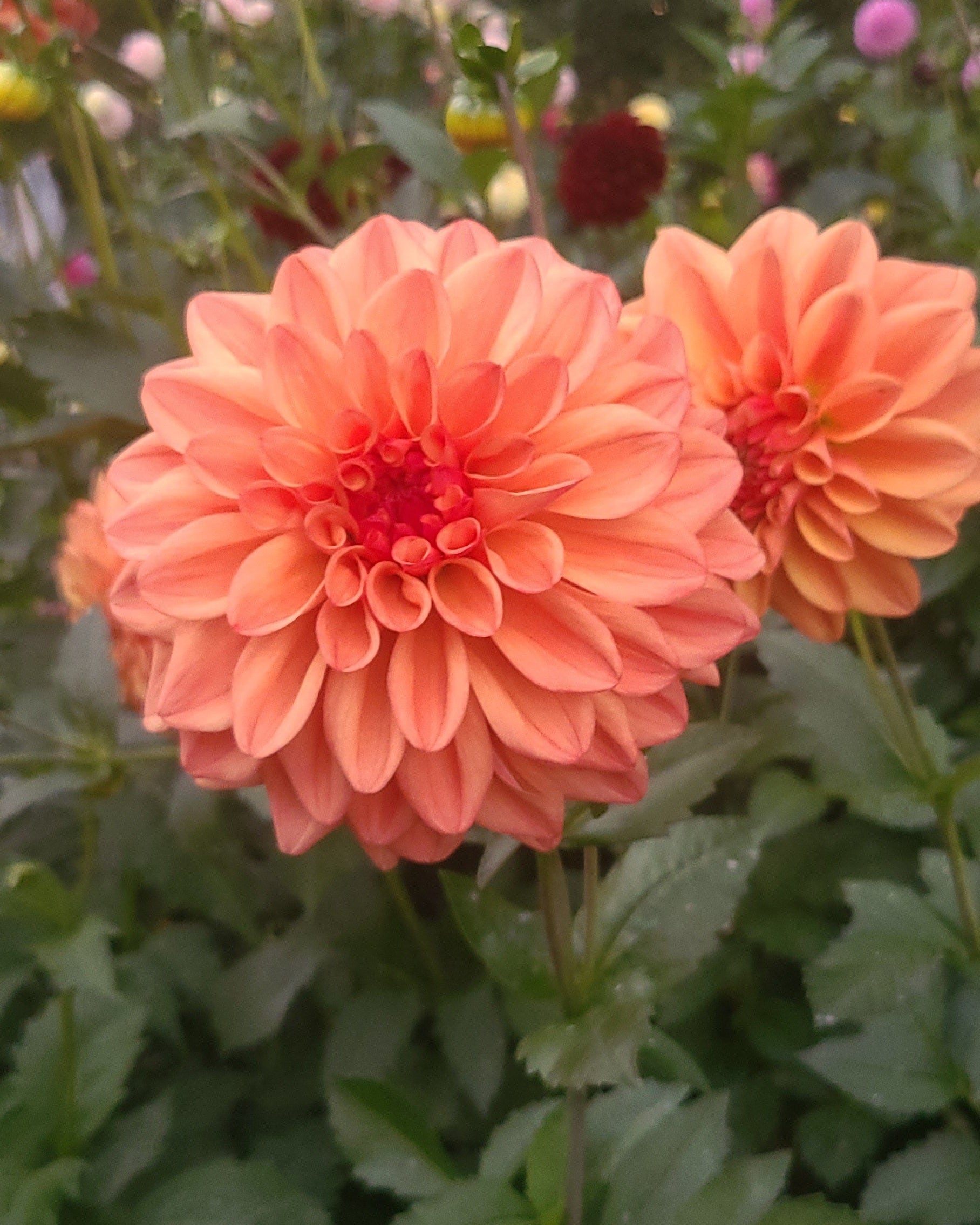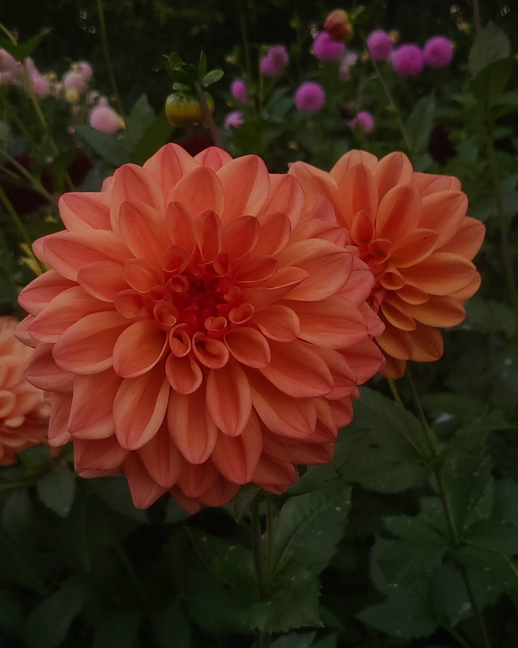 A coppery peach colored 5" formal decorative type dahlia. New to me in 2025, I was impressed that it gave quite a few flowers for this size bloomer. A little taller than some, this dahlia grows about 5' tall in my garden.