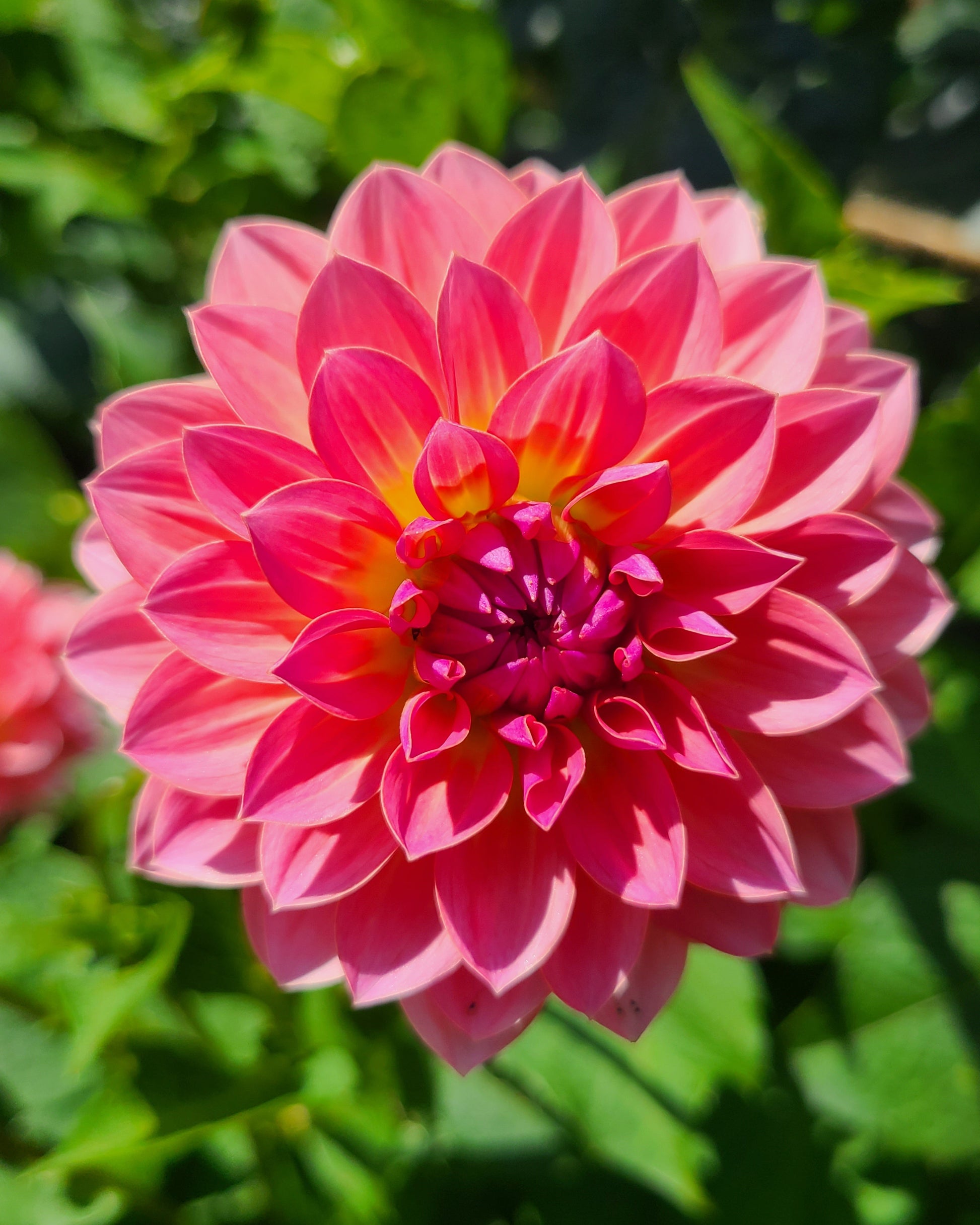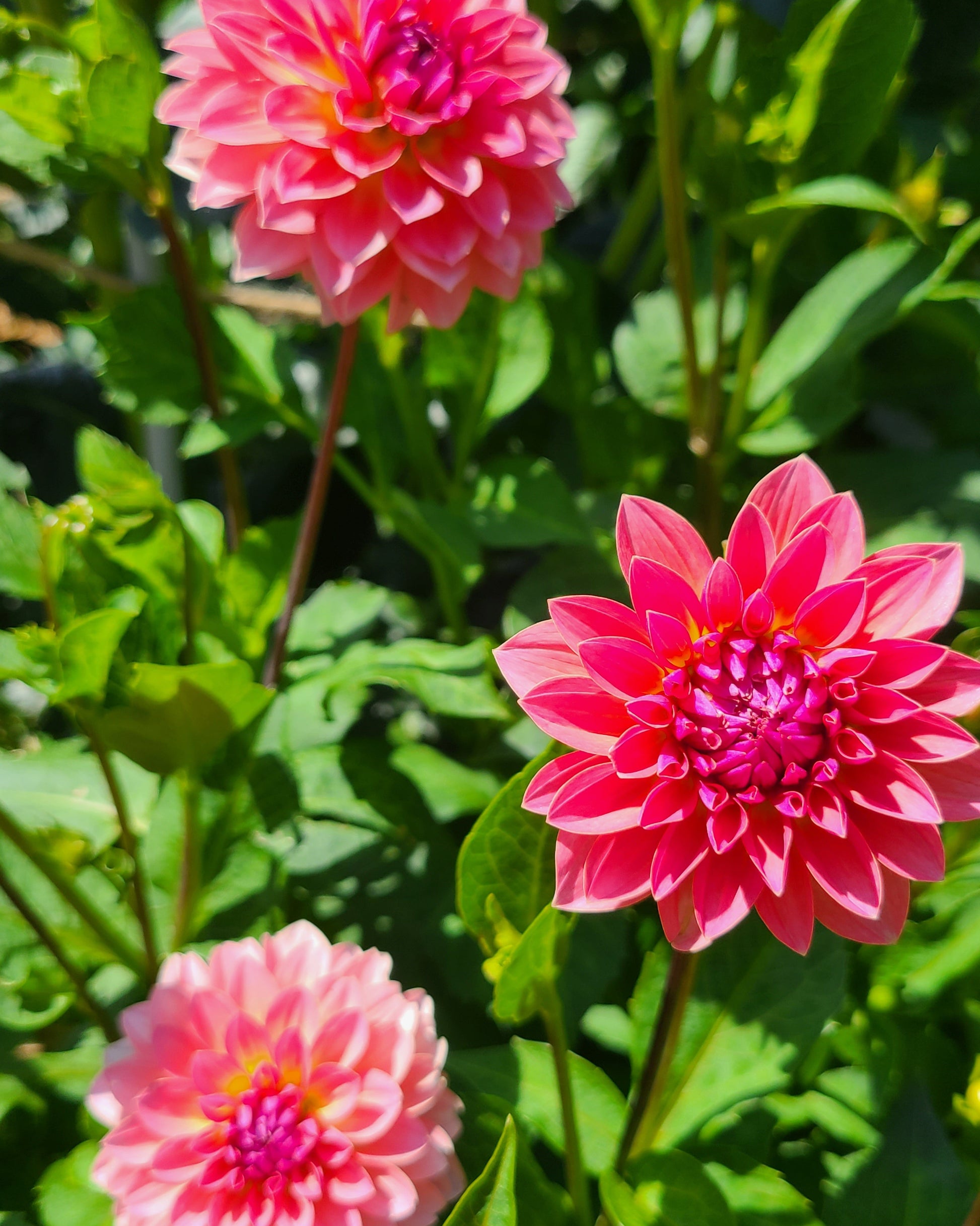 My daughter's favorite dahlia, this is a petite little 2' pink-salmon flower has a hint of yellow at the center. It's a shorter plant at 3' tall and is just covered in blooms in the summer. It does prefer plenty of room and sun, and doesn't perform as well when crowded and shaded by taller dahlias.