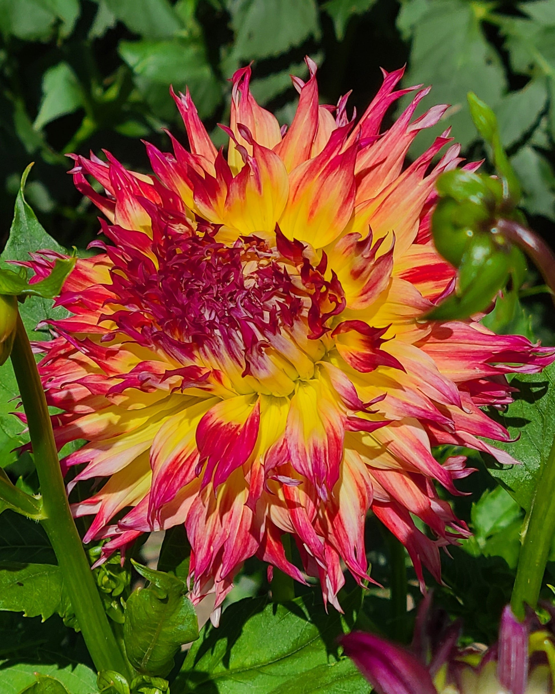 This 7" fluffy looking dahlia is sunny yellow in the center with bright red tips on the petals. Long, strong stems. She is in the group of dahlias that are lacinated, meaning the tips of the petals are notched or split, giving it a fringed appearance.