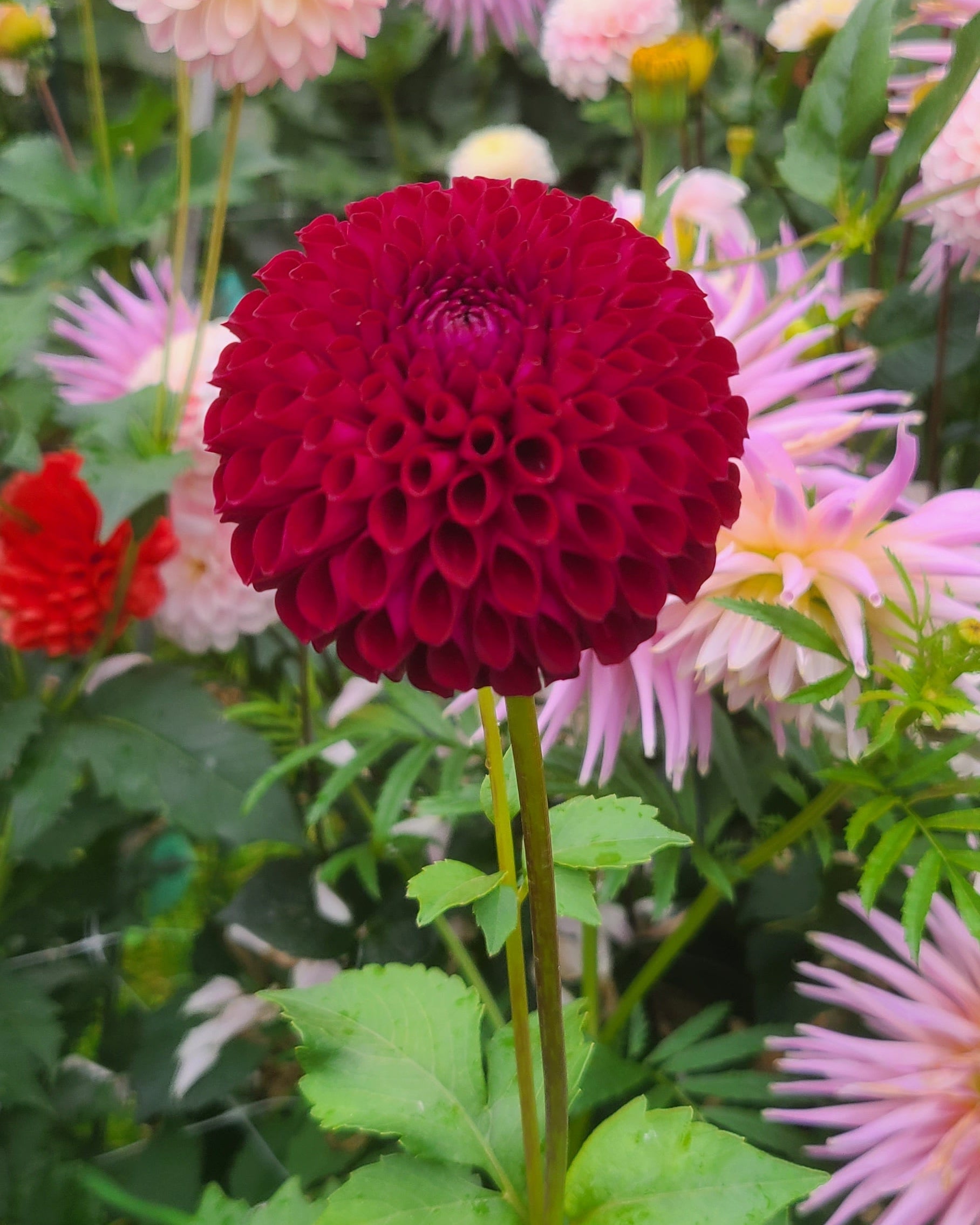 A dark purple-red ball. 2025 was my first year growing this variety and it was very slow to start blooming. Hopefully it will bloom better the next year I grow it. I loved the symmetry of this ball shaped flower. Definitely a deeper purple-red than Skipley TNT Ball.