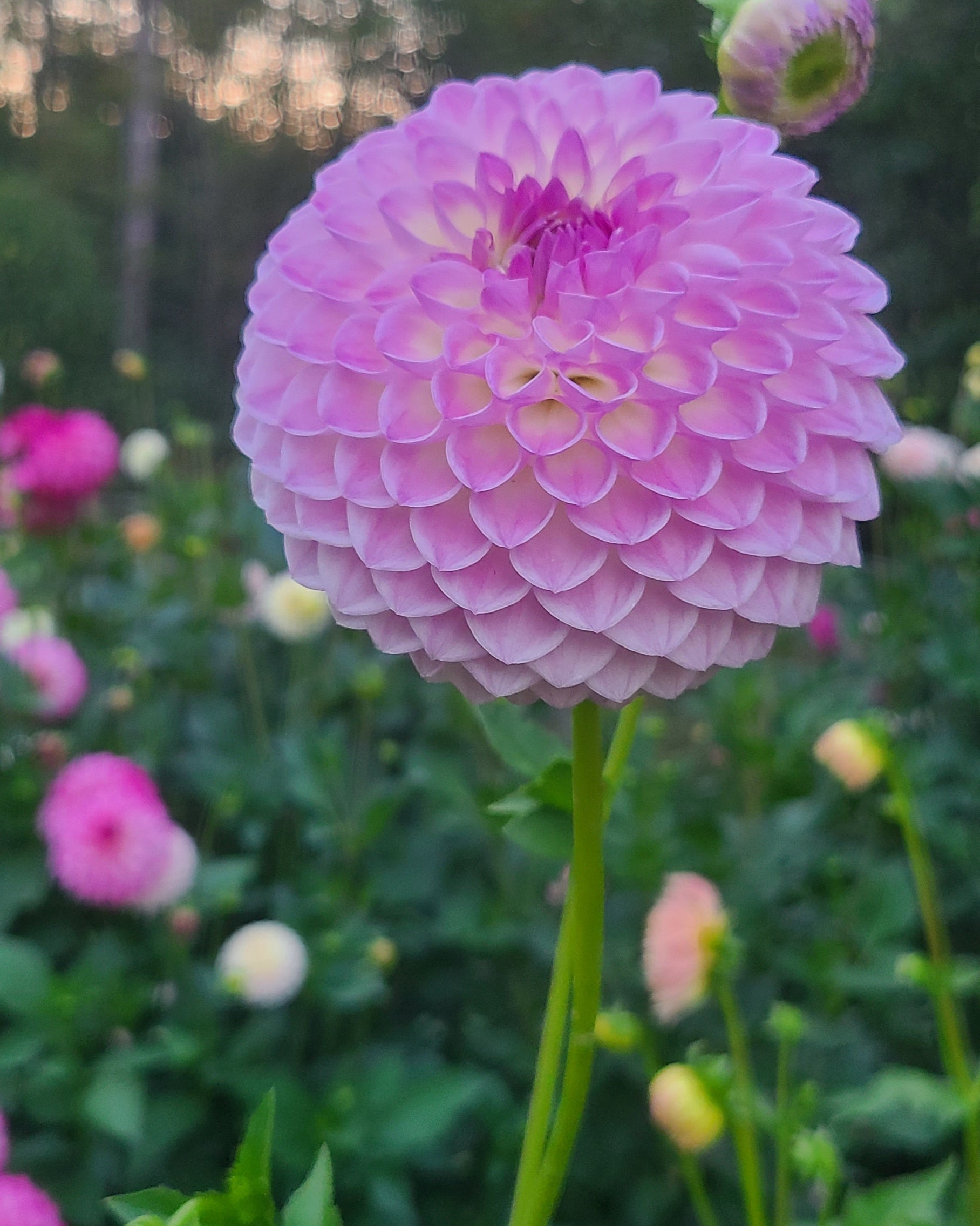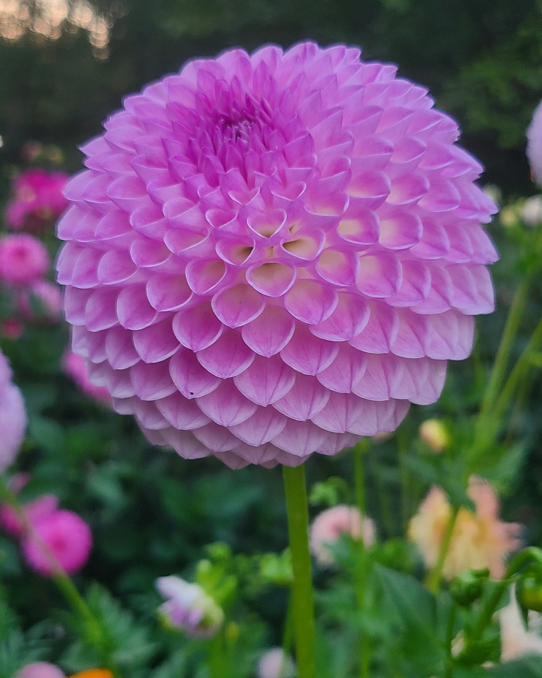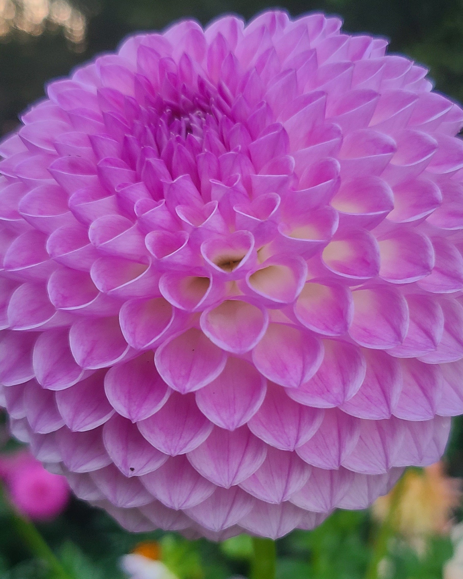 A highly sought after variety for good reason. She is stunning in a pink-lavender and white, with a very high petal count. It is classed as a formal decorative variety, but it makes me think of a ball because of how round it appears.